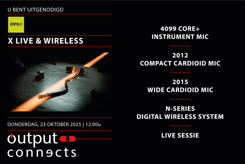 Op 23 oktober 2025 organiseert Output samen met DPA Microphones een inspirerende sessie rondom live microfoons en de nieuwe draadloze technologie. Dit alles in samenwerking met de specialisten van DPA uit Duitsland en Nederland.
